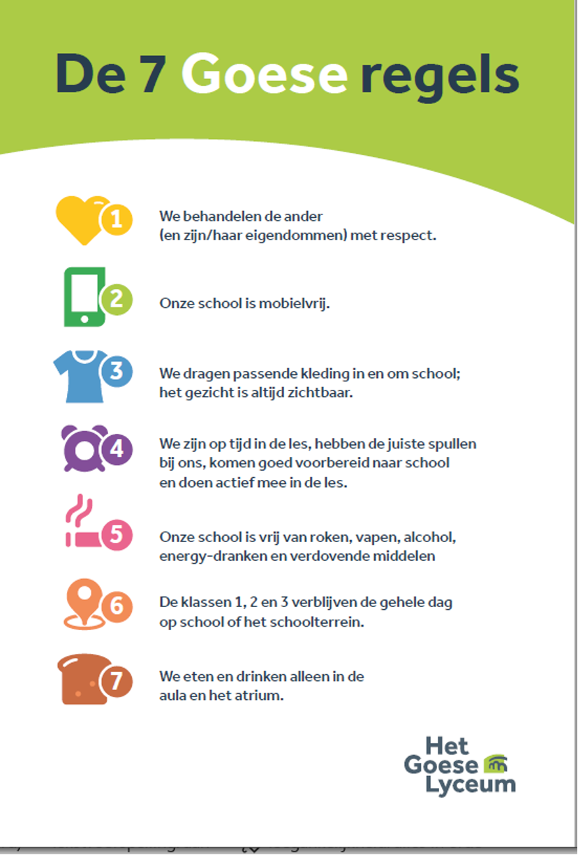 Medewerkers, leerlingen en ouders van leerlingen van Het Goese Lyceum hechten waarde aan een veilig en ontspannen schoolklimaat. Dit klimaat ontstaat wanneer iedereen een bijdrage levert, op grond van déze leefregels.